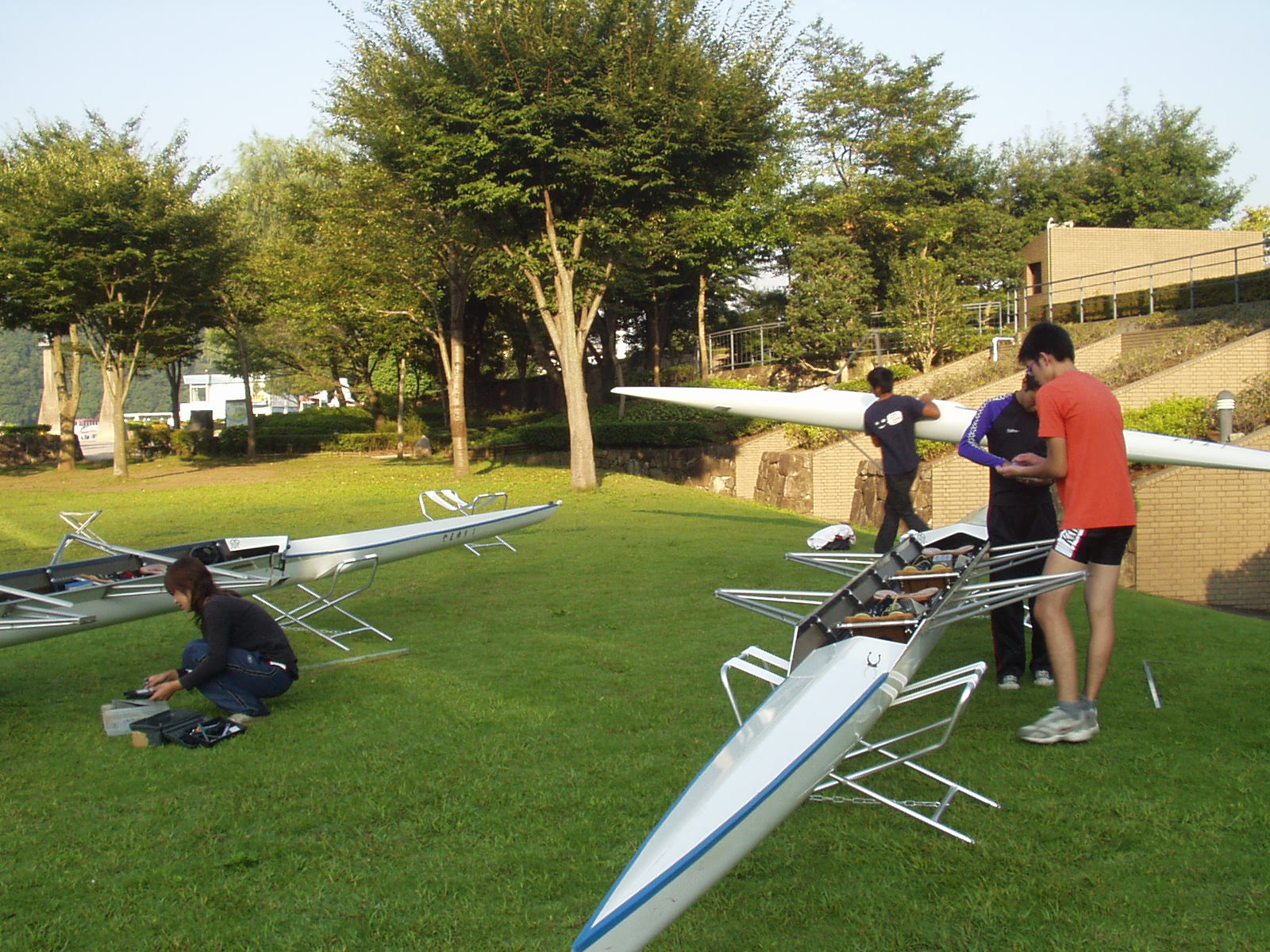 エキストラとして北里大学の学生さんたちが暑い日差しの中、リアルな漕艇を披露しています。